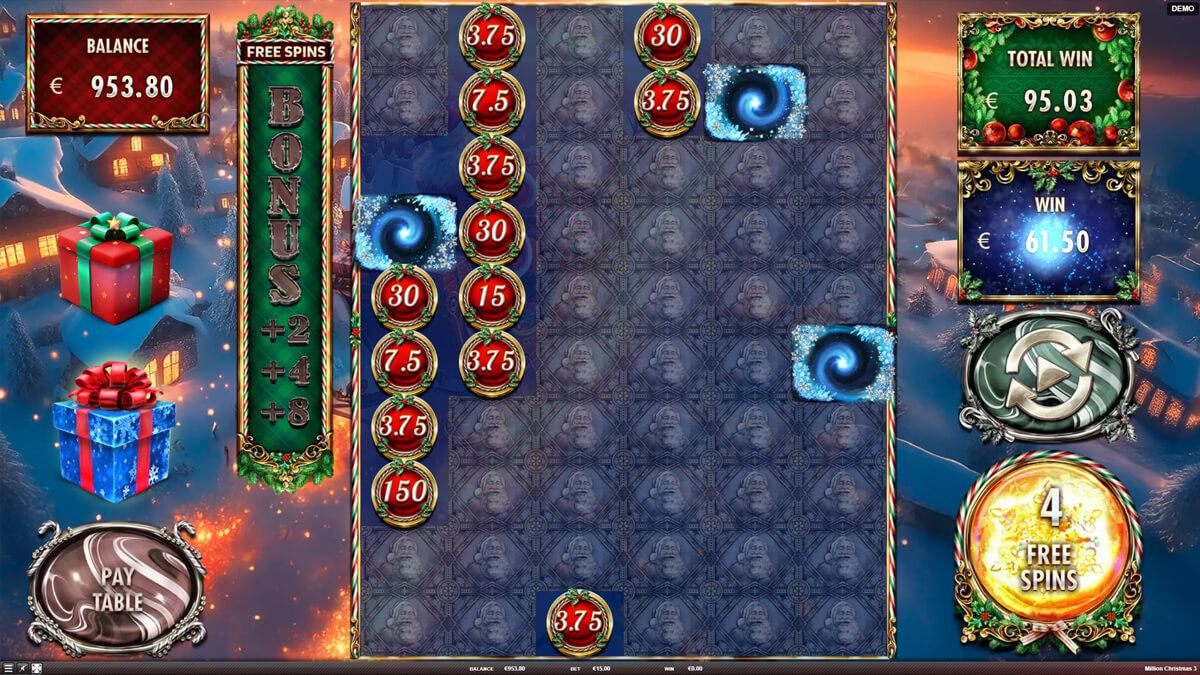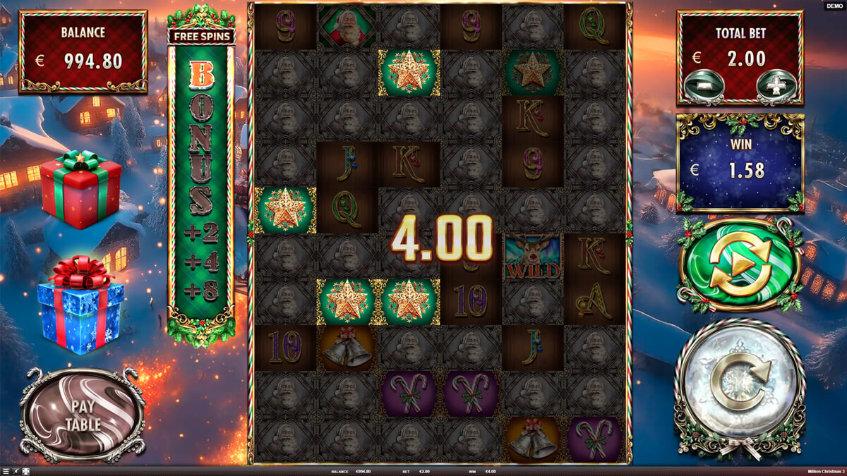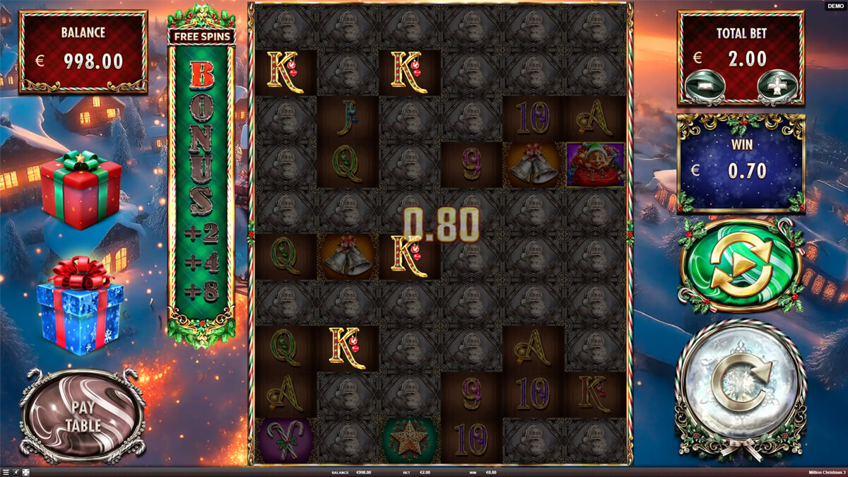 Million Christmas 3 continues Red Rake’s tradition of expansive grid mechanics, presenting a 10×6 setup with one million active paylines. The RTP of 96.6 % aligns with the studio’s premium-tier model, aiming to maintain statistical fairness within a high-risk framework. With a bet range between 0.20 and 15, the slot accommodates moderate staking strategies but leans toward calculated play rather than aggressive wagering. The max exposure is theoretically positioned near x10,000, derived from multiplier combinations achievable during the Free Spins sequence.