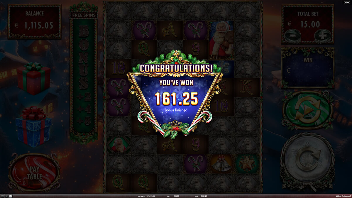High-value Symbols: Santa Claus, Golden Gifts, and Festive Bells — deliver premium payouts and appear stacked across reels.