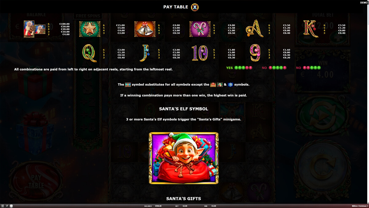 Million Christmas 3 Slot Pay Symbols & Their Values