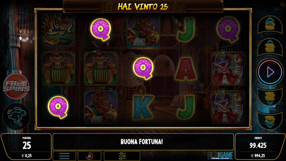 The theme merges circus imagery with horror elements, presenting aggressive visuals of clowns, bears, tigers, and distorted performers. Symbols are bold and intentionally unsettling, reinforcing psychological pressure during extended non winning cycles. Gameplay is streamlined, with spins primarily serving to unlock Free Spins either naturally or through the Buy Feature, and minimal variance dispersion outside the bonus.