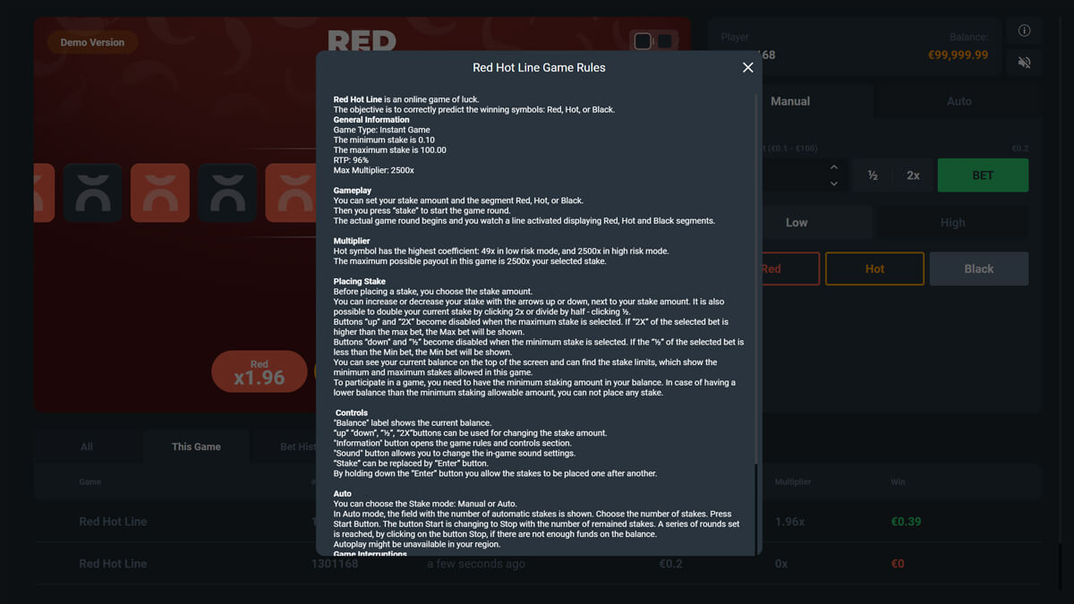 Red Hot Line does not publish an official volatility rating, but high risk mode can significantly increase payout variance compared to low risk mode.