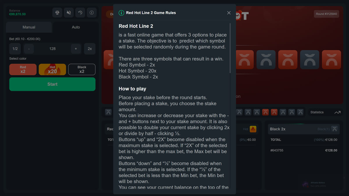 Red Hot Line 2 retains the black, red, and fire themed aesthetic introduced in the original version, maintaining visual continuity within the sub series. The RTP is fixed at 96 percent, while volatility is not formally specified. The maximum win remains capped at 2500 times the stake. Bets range from 0.10 to 50, ensuring flexibility across player segments. Structurally, the game replaces reel based mechanics with a symbol prediction interface featuring three selectable outcomes per round.