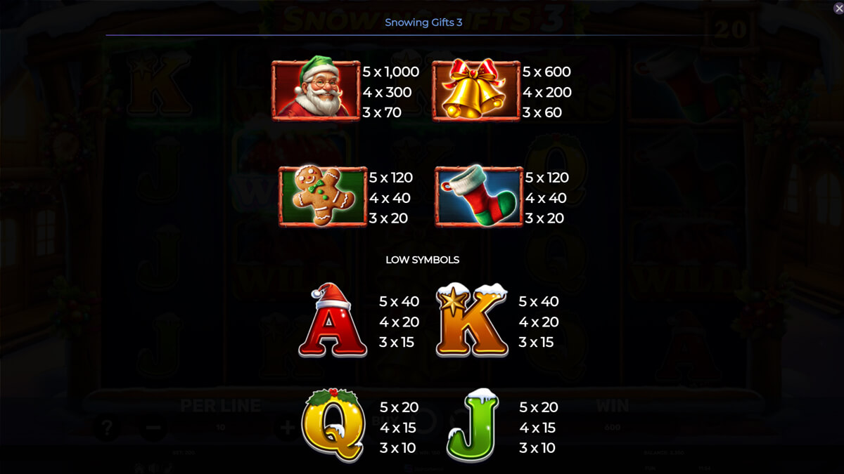 Snowing Gifts 3 is a 5 by 4 slot running on a fixed 20 line structure with a 95.78 RTP and high volatility. The model targets controlled risk with the potential for large multipliers through stacked modifiers and wild expansions. Built for bet levels between 0.2 and 200, the slot aligns with a broad user range while the top end 3000 exposure anchors its volatility curve around key premium events. As part of a holiday themed environment, it uses consistent winter and Santa aligned iconography to maintain thematic cohesion.