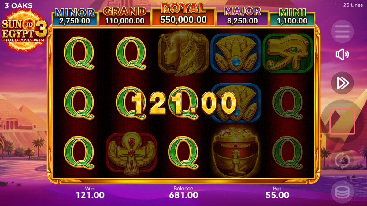 The mathematical configuration of Sun of Egypt 3 concentrates value into infrequent but extreme outcomes. High volatility ensures that base game returns remain modest, while the RTP is primarily realized through bonus features. The relatively conservative maximum bet limits absolute bankroll swings, which aligns with the elevated exposure multiple. This structure supports experienced players who prioritize peak outcomes over session stability, matching expectations for a third entry designed to raise the stakes.