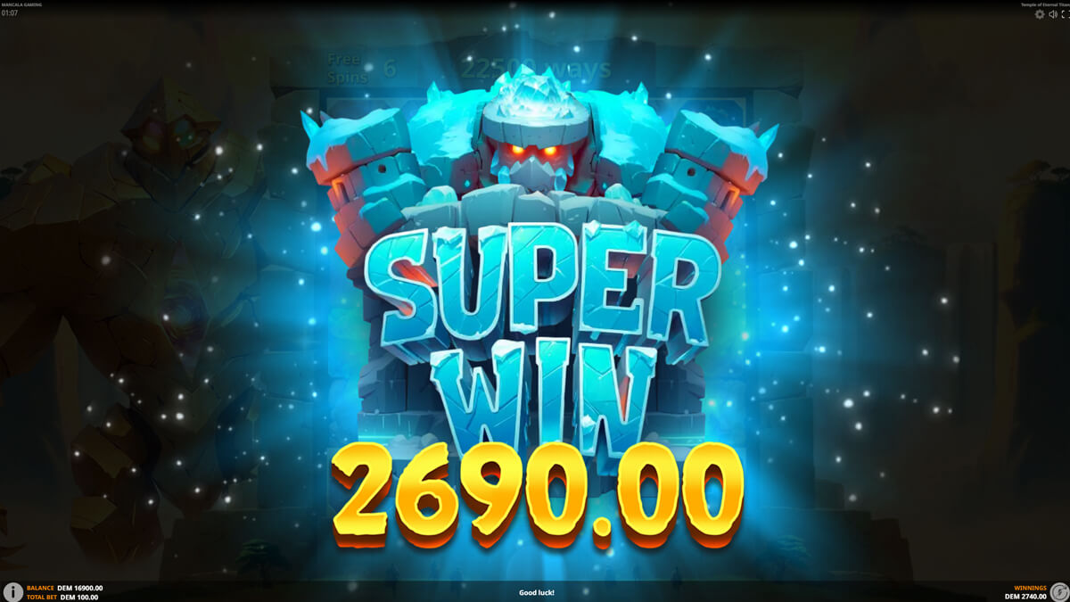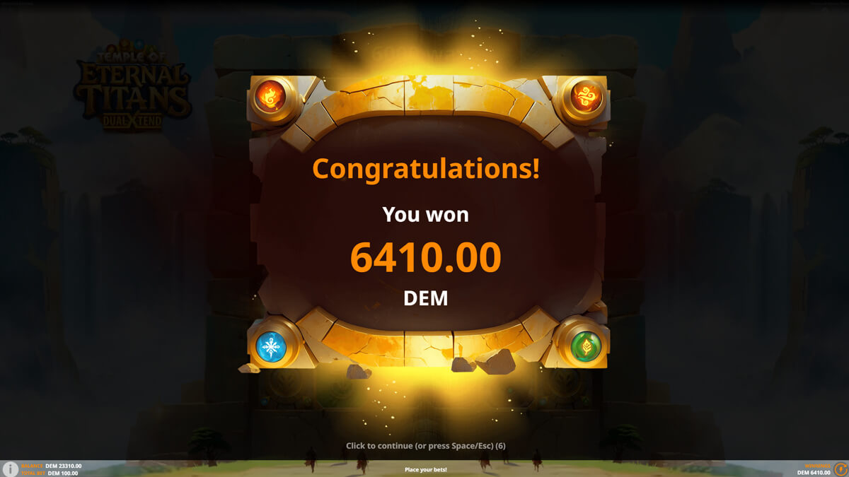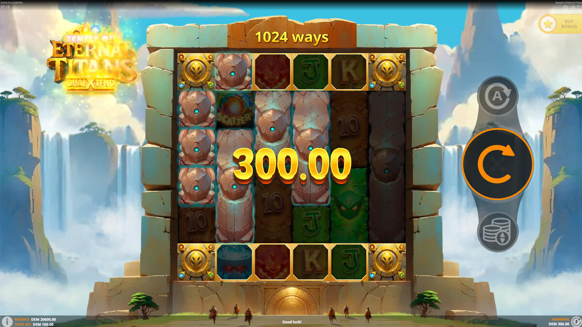 Temple of Eternal Titans does not appear to be a sequel or branded continuation of an existing Mancala Gaming title. While it employs cascades and multiplier stacking seen widely across the industry, its DualXtend mechanic and framed symbol evolution create a structural identity distinct from standard grid cascade slots.