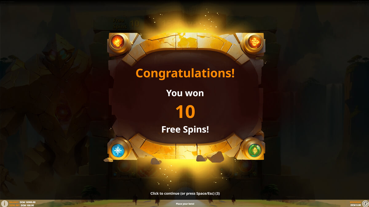 The theme draws from an ancient mythological setting guarded by four elemental titans. Symbols fall into place and cascade upon forming winning combinations. Paid symbols are limited to three core values, reinforcing the importance of symbol upgrades rather than large paytable diversity. Special features include Silver and Golden Frames that evolve symbols into Wilds, random multipliers influenced by symbol size, and a bonus game where Wilds carry fixed x2 or x3 multipliers. Visually, the game prioritizes clarity of grid movement and animated symbol growth.