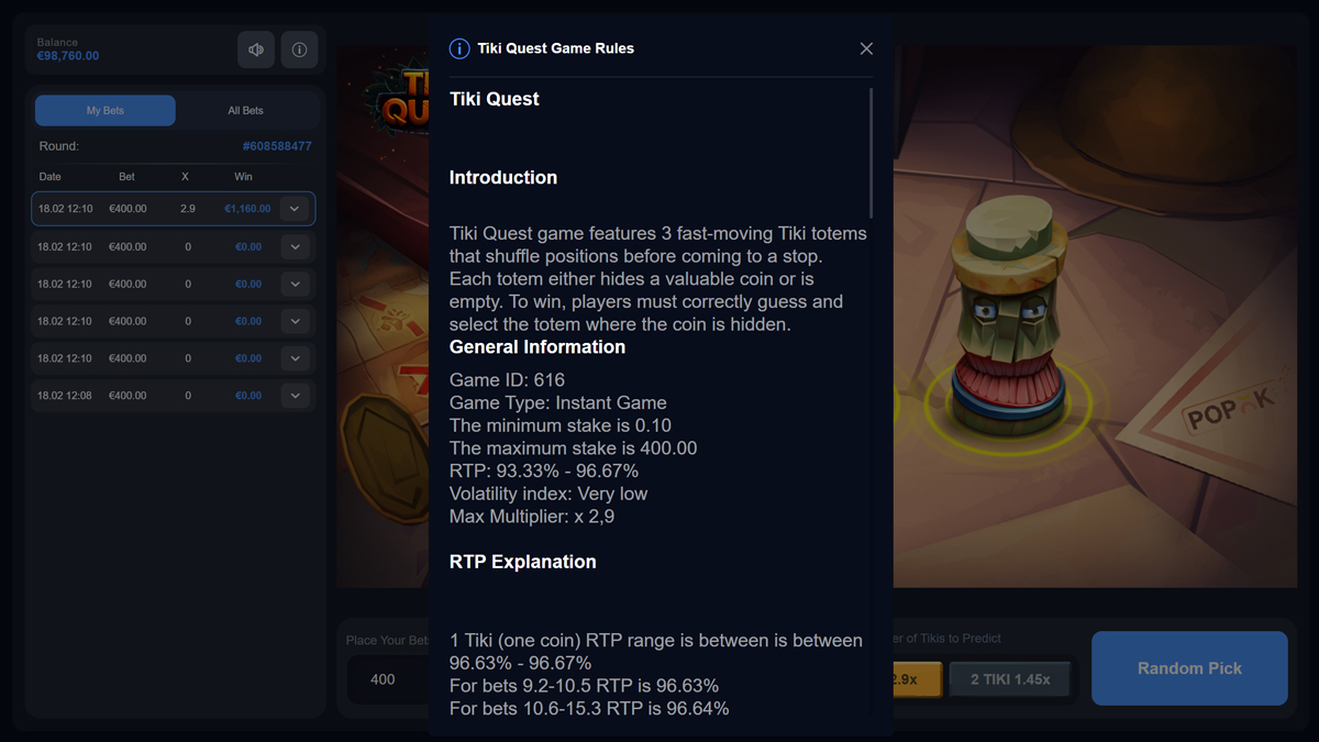 Popok Gaming frequently develops simplified interactive formats alongside traditional slots, often experimenting with alternative wagering mechanics. Their mathematical approach typically combines competitive RTP values with clearly defined volatility brackets. In Tiki Quest, the emphasis is placed on accessibility and controlled exposure rather than layered complexity. The integration of a progressive jackpot within a low volatility shell demonstrates an attempt to enhance engagement without destabilizing payout consistency.
