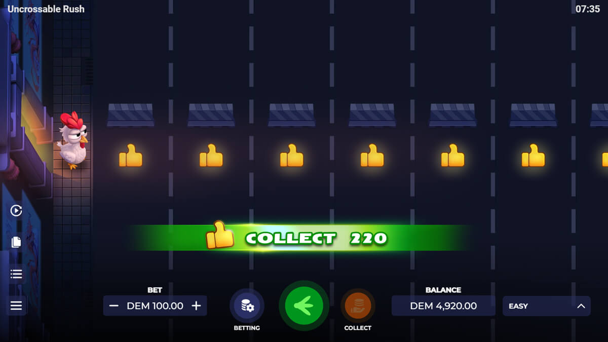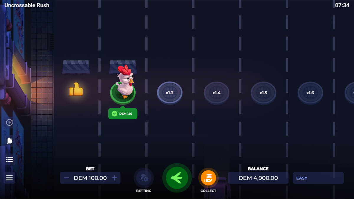 Uncrossable Rush by Evoplay is a streamlined, high-stakes arcade-style instant game built atop the licensed CrossyRun™ mechanic. With an RTP of 96 % and a maximum win potential of up to x10,000, it amplifies decision-making tension by having players guide a chicken across a 24-lane highway, choosing at each step whether to cash out or risk further progression. The simplicity of the step-based model belies a sophisticated volatility architecture: difficulty levels scale risk and reward, while the cash-out option introduces strategic branching uncommon in standard slot formats. Mathematically and behaviorally, the design favours high-variance bursts over steady pay-out flows, aligning with thrill-seeker profiles rather than casual spin-play.