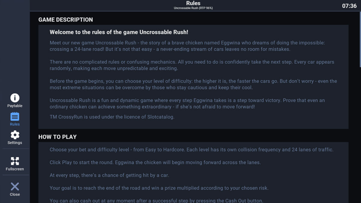 Uncrossable Rush places players in the cross-road scenario where the theme centres on a daring chicken (Eggwina) attempting to navigate a 24-lane highway fraught with traffic. The game does not use a traditional reel layout; instead it emphasises sequential decision-making. With an RTP pegged at 96 % and an “Adjusted” variance descriptor, the game situates itself in a medium-to-high risk band. The top theoretical win of x10,000 means substantial upside is possible, especially when higher difficulty settings are engaged.