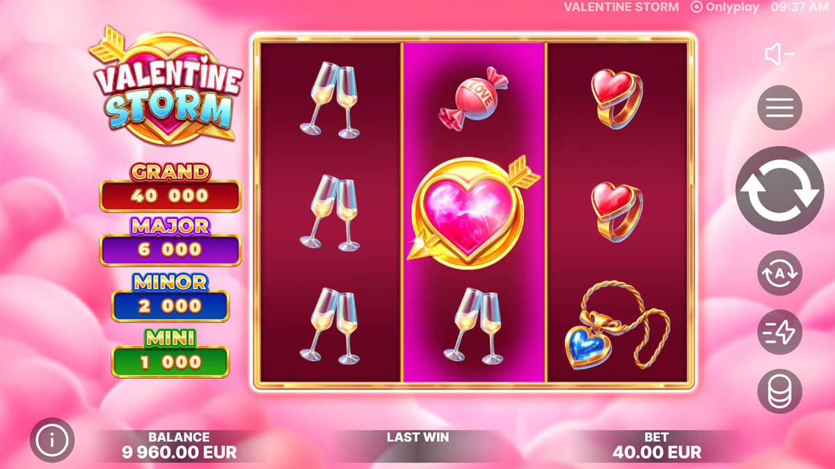 Valentine Storm is designed to create emotional engagement through gradual buildup rather than constant stimulation. The restrained base game encourages patience, while the bonus mechanics provide focused bursts of reward that reinforce anticipation and perceived value.