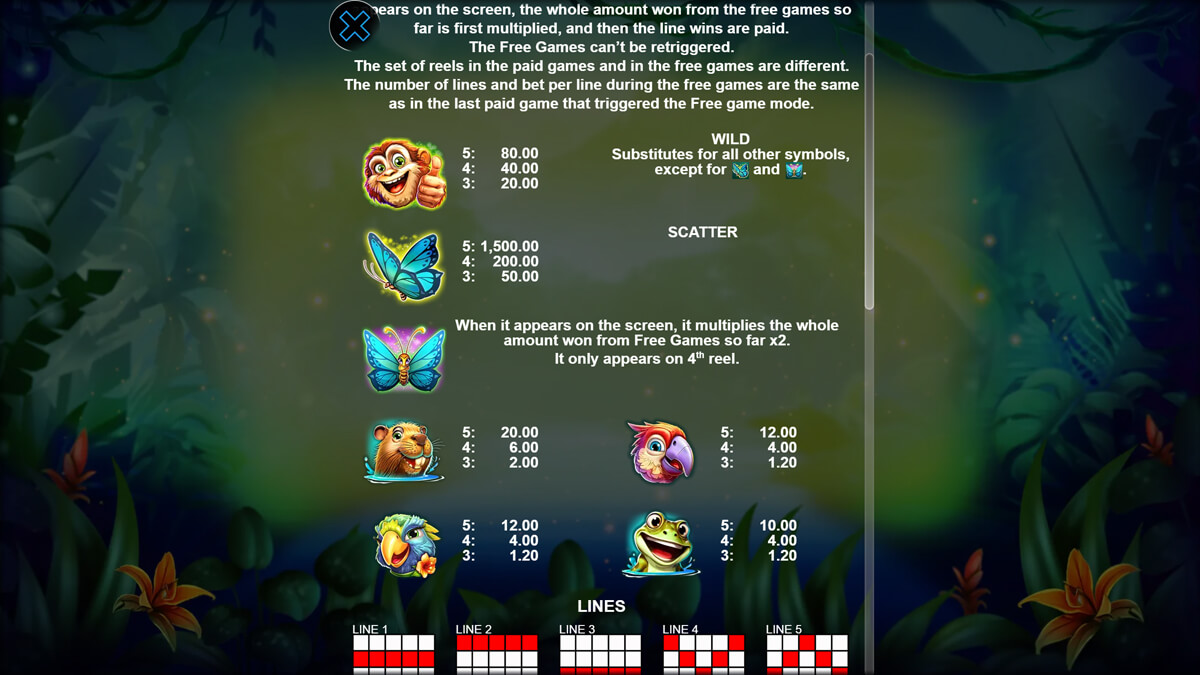 The theme draws from jungle exploration, populated by parrots, frogs, butterflies, and beavers, with vibrant greenery framing the reels. Visually, the slot emphasizes clarity and contrast, ensuring symbol recognition remains immediate. Gameplay is driven by traditional line wins, Wild substitution, scatter triggered free spins, and a multiplier mechanic that activates during bonus play, resulting in a steady but suspense oriented rhythm.